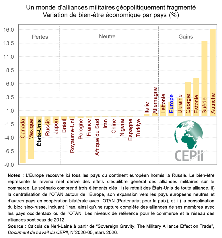 Les États-Unis subiraient une perte économique notable de près de 4 % de leur revenu réel, entrainant avec eux le Canada et le Mexique en raison de leur dépendance commerciale, tandis que l'Europe, grâce à son intégration commerciale et sa coopération renforcée, émergerait comme le bloc gagnant avec un gain moyen de bien-être économique de 3 %. Les grands pays européens, déjà fortement intégrés, verraient peu de changements. Les pays intégrant ce réseau bénéficieraient en revanche de gains substantiels.