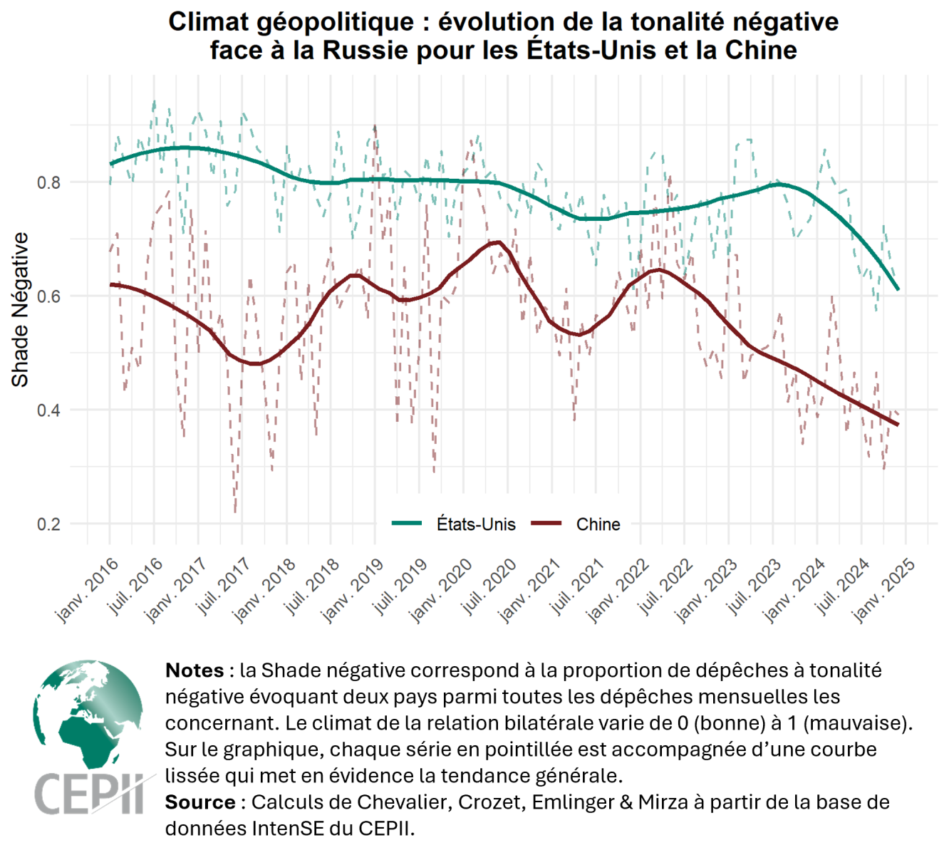 La nouvelle base de données IntenSE (Intensity and Shade of Events) du CEPII exploite des dépêches d’agences de presse issues de la base GDELT afin de construire l’indicateur la Shade, qui renseigne sur la tonalité négative du climat géopolitique au niveau des relations bilatérales de 201 pays depuis 2016 sur une périodicité mensuelle.