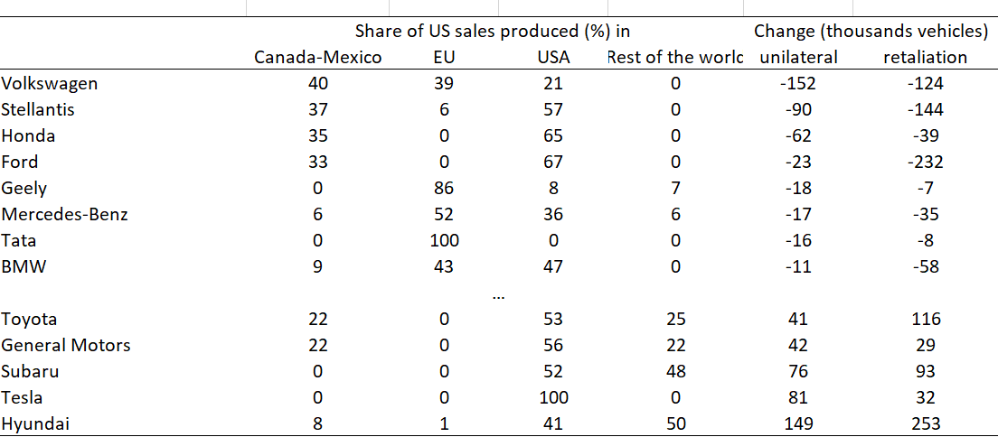 The effects on manufacturers, because they manage complex networks of plants in many countries, can differ from the impact on their headquarter countries. The exposure of a firm to the ongoing trade conflict depends on its production facilities and on its ability to reallocate production meant for American consumers to factories not targeted by the new duties. Volkswagen, Stellantis, and to a lesser extent Honda, which today import more than a third of their passenger cars sold in the United States from Mexico or Canada, would be the most affected, with drops in sales of around 152,000 vehicles for Volkswagen and 90,000 for Stellantis (Table 2).