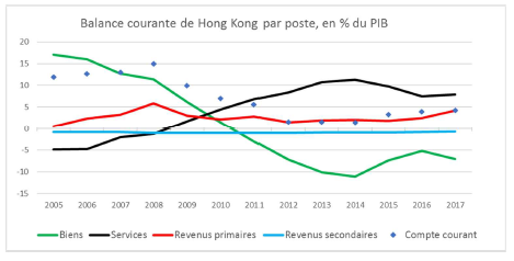 Le compte courant de la balance des paiements se décompose en quatre grands postes : les biens, les services, les revenus primaires (principalement rémunération des facteurs de production) et les revenus secondaires (essentiellement coopération internationale). La balance ou solde de chaque compte résulte de la différence entre les crédits (ce que le pays gagne en exportant les biens, les services et les actifs) et les débits (ce qu’il dépense en important). Le graphique 1 montre la structure du compte courant pour l’ensemble des paradis fiscaux. Ces tendances agrégées masquent cependant des spécificités importantes pour certains pays, que nous détaillons pour cinq pays (Suisse, Irlande, Singapour, Hong Kong et Luxembourg) qui représentent à eux seuls environ 84 % du PIB de cet agrégat (graphiques 3 à 7 en fin de billet).