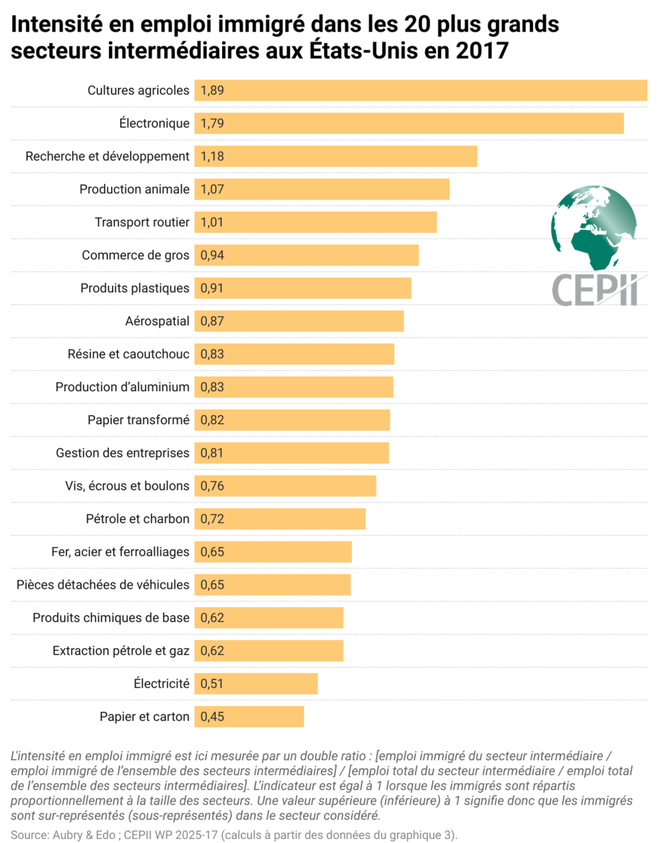 Une étude du CEPII, portant sur les États-Unis sur la période 2003-2017, montre qu’un autre canal opère sur la performance des secteurs exportateurs : une augmentation de l'emploi immigré dans les industries en amont entraîne une hausse des exportations en aval. Un effet qui provient en partie de l’amélioration de l'efficacité productive qui réduit le coût des intrants en amont. En se focalisant sur les 20 secteurs intermédiaires les plus importants aux États-Unis en 2017, classés par valeur des ventes, on observe que les immigrés sont particulièrement représentés dans les cultures agricoles (blé, maïs), l’électronique (composants, circuits imprimés), et la R&D (laboratoires, conception de produits). Les secteurs exportateurs qui dépendent de ces industries bénéficient ainsi de la présence des immigrés qui y sont employés et des gains de productivité qui y sont associés.