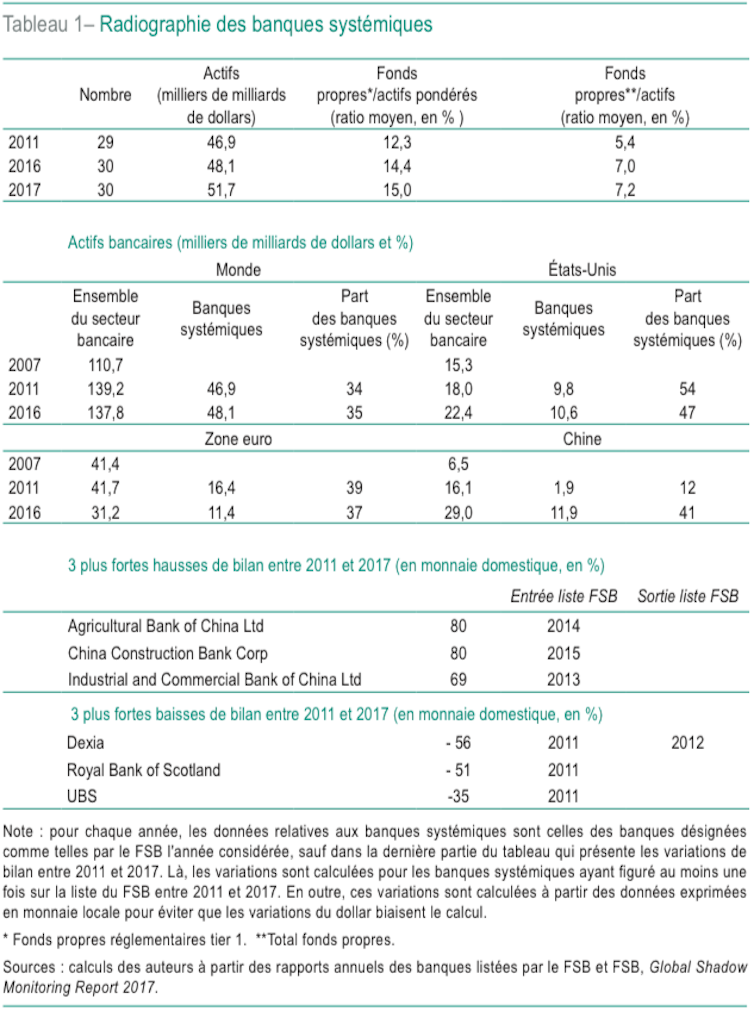 Le nombre de ces G-SIBs n’a pas diminué depuis la première liste en 2011. Certains établissements ont certes été sortis de la liste (par exemple la banque espagnole BBVA ou le groupe français BPCE), mais d’autres ont fait leur entrée (notamment des groupes bancaires chinois). Entre 2011 et 2017, leur nombre est ainsi passé de 29 à 30 et leur bilan agrégé a grimpé de 46 859 milliards de dollars à 51 676 milliards de dollars. Si leur part dans le bilan agrégé de l’ensemble des banques au niveau mondial est restée relativement stable autour de 34 % entre 2011 et 2016, c’est parce que le secteur bancaire mondial a crû encore plus. À noter cependant que les dynamiques régionales divergent. On observe une baisse du poids des banques systémiques aux États-Unis (47 % en 2016 contre 54 % en 2011) et une relative stabilité en Europe (37 % en 2016 contre 39 % en 2011). Le cas de la Chine est particulièrement préoccupant : la part des banques systémiques dans le bilan agrégé de l’ensemble des banques du pays y a plus que triplé depuis 2011 pour atteindre 41 %.